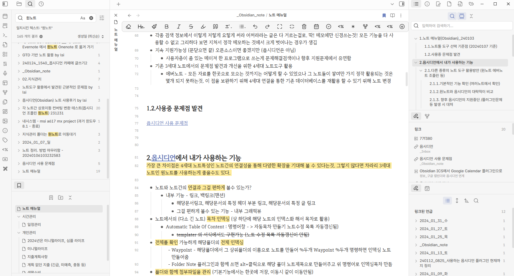 (현재 나는 원노트(오래전) -> 에버노트(2010~2023) -> 옵시디언(2023~) 을 사용하고 있다.)