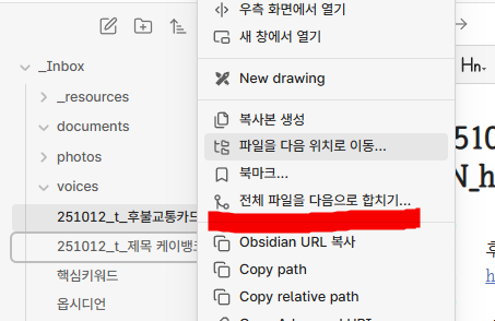 - [옵시디언]에도 노트를 다른 노트와 합치기 기능은 제공한다.