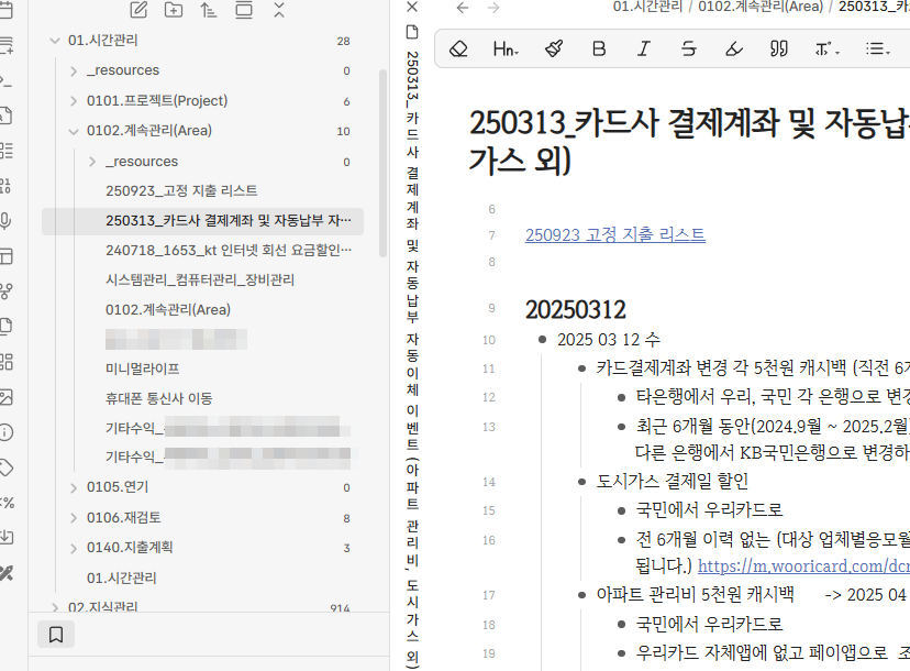 예) 카드사 결제계좌 및 자동납부 관리 노트가 [계속관리]에서 기록되어 사용되고 있는가?